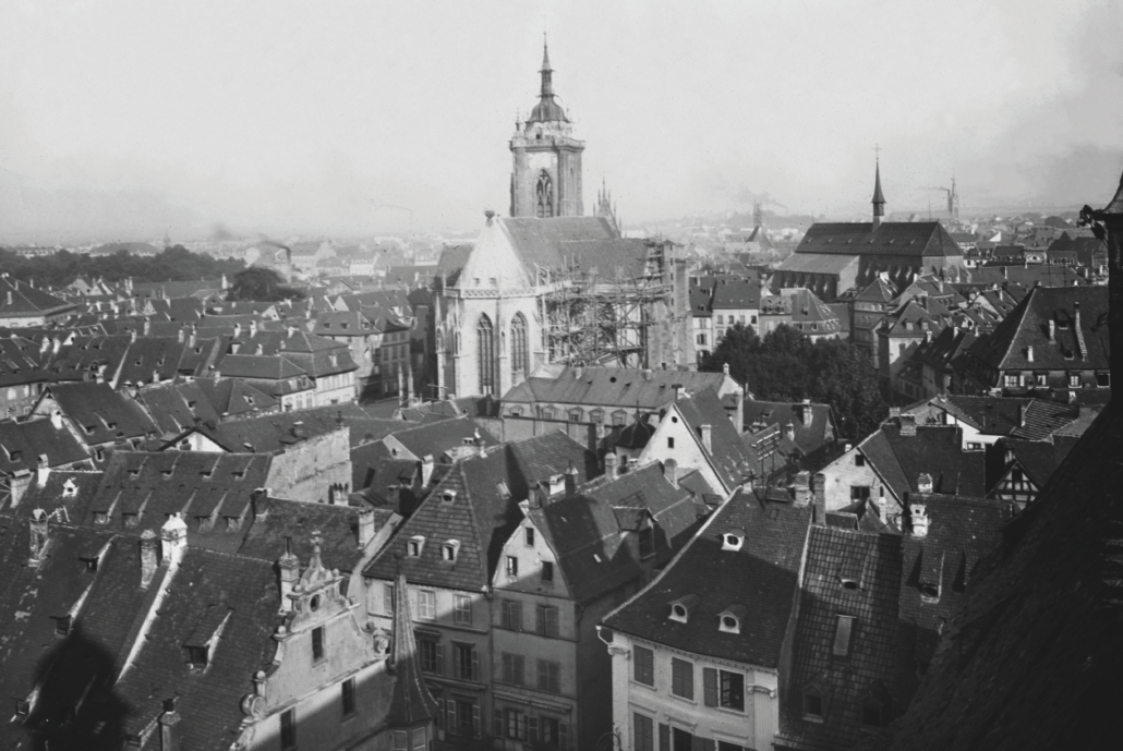 Ce cliché permet d’observer le monument à la mémoire de Martin Schongauer dans son écrin original, au centre du cloître du Musée Unterlinden. En 1861, Auguste Bartholdi réalisa cette statue à la suite d’une commande de la Ville de Colmar et de la Société Schongauer. Cette dernière, qui gère le musée depuis son ouverture en 1853, s’est placée sous le vocable de Martin Schongauer, célèbre peintre et graveur colmarien du 15e siècle.